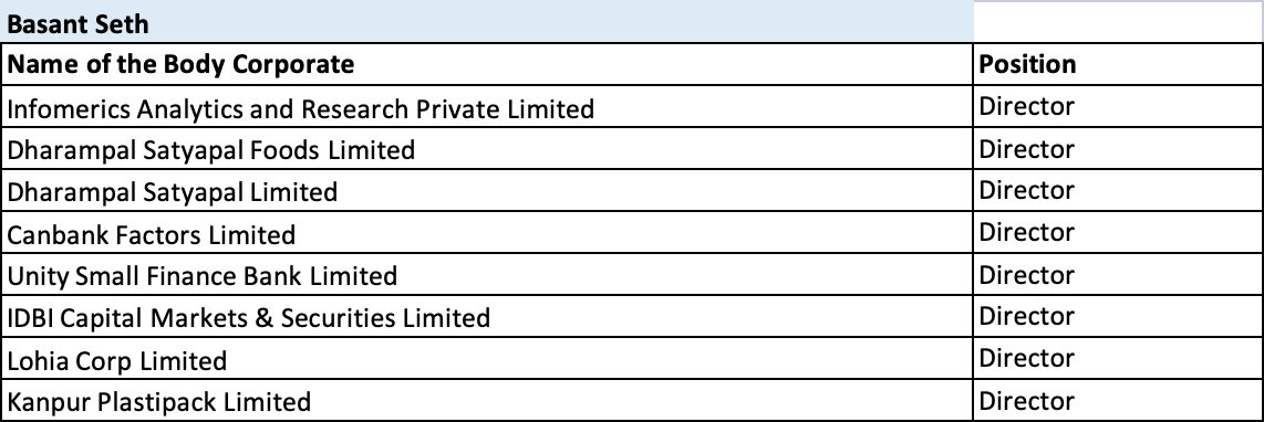 Mr. Basant Seth has over 40 years of experience in finance & banking, management & administrative matters. He has headed Institutions like Syndicate Bank (as Chairman and Managing Director) and SIDBI (as Deputy Managing Director). He has also served as Independent Director of State Bank of India, Central Board, where he headed several committees of the Board. He was appointed as Information Commissioner in the Central Information Commission for a period of 5 years. He has held various positions at field level overseas posting and in administrative offices, posted as General Manager and Chief Financial officer of the Bank from October 21, 2002, to April 30, 2006, and thereafter as Chief Risk Officer up to February 28, 2007.